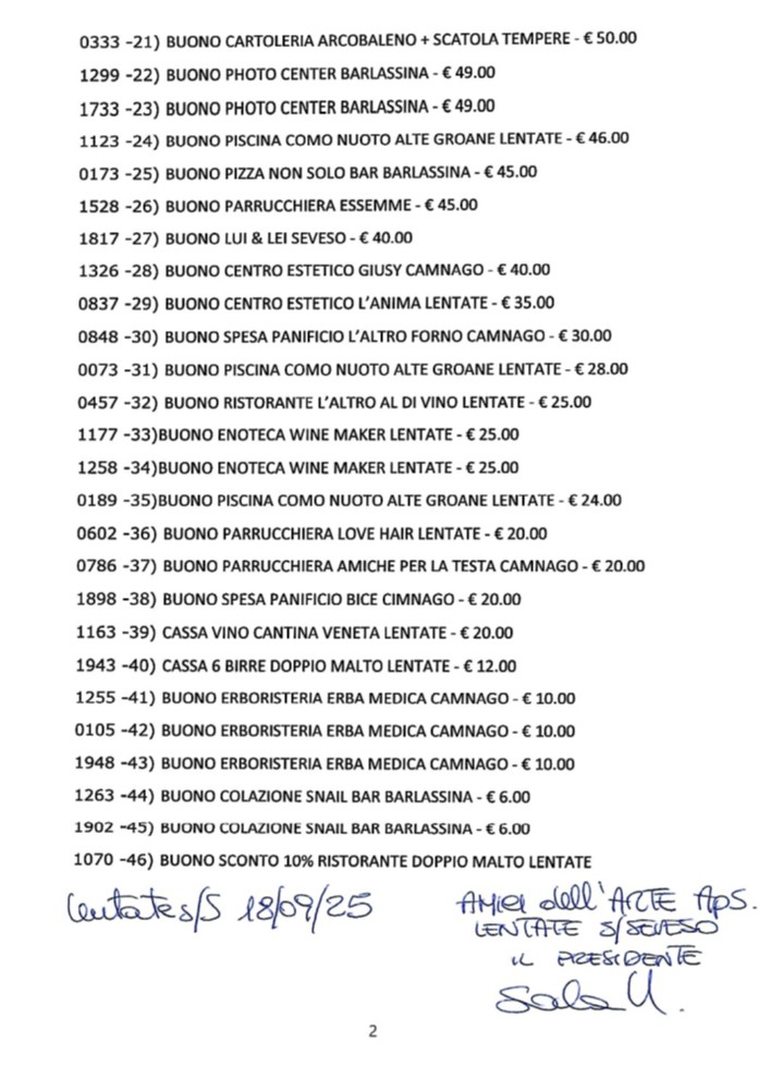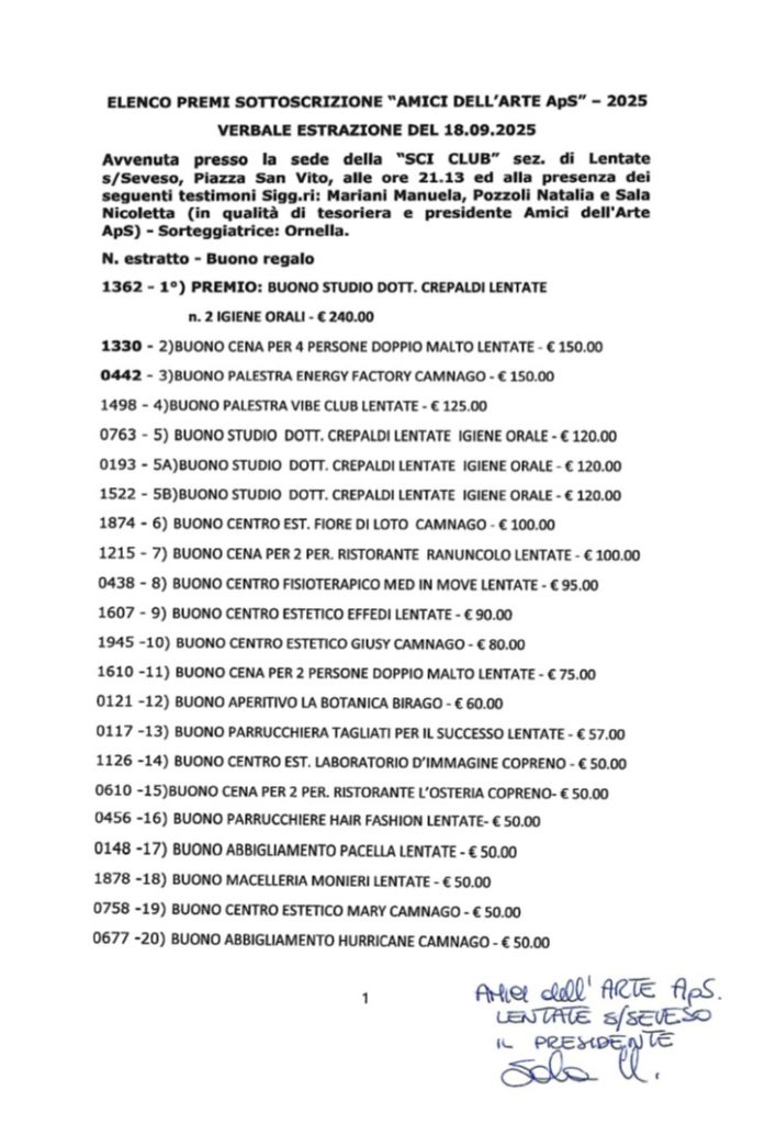 In caso di impossibilità a recarsi presso lo SCI CLUB il 25 ottobre è possibile inviare una email a amiciarte.lentate@libero.it entro il 31 ottobre 2025. Faremo il possibile per concordare un’altra modalità di consegna del premio. Ringraziamo anticipatamente per la vostra comprensione.